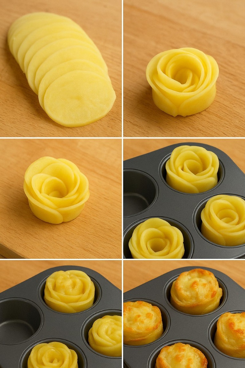 Иногда самые простые продукты превращаются в маленькое кулинарное волшебство. Стоит взять обычную картошку — и она вдруг становится цветком. Стоит добавить немного сыра — и кухня уже пахнет уютом. А если подключить мясо… всё, шансов устоять у этого блюда не останется. Сегодня у нас картофельные розочки — в двух версиях: нежной и романтичной, и второй — уже по-взрослому сытной, с курицей. 📌Сначала классика. Тонко нарезанные кругляши картошки раскладываются веером, чуть соли, перца, щепотка любимых специй, и сверху сыр. Пара минут — и у тебя в руках что-то, что выглядит как мини-выпечка из кафе с французским характером. Румяное, ароматное, исчезающее быстрее, чем остывает. 📌Но если душа просит основательности, включается второй вариант — розочки с куриным филе. Мелкие кусочки нежной курицы отправляются между слоёв картошки, добавляют сочность и настроение «это полноценный ужин, а не закуска». Чуть сливок или ложечка сметаны внутрь — и структура становится кремовой, прямо тающей. Бекон