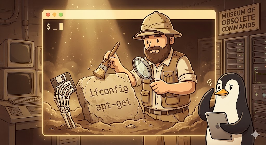 Вы когда-нибудь задумывались, почему в интернете полно инструкций, которые пахнут нафталином? Новичок, решивший приобщиться к миру пингвинов, первым делом лезет в Гугл. А там — залежи мудрости за 2010, 2015, а то и 2005 год. И вот ты, счастливый, копируешь команду, вставляешь в терминал, оно работает. Ты доволен. А твой дистрибутив смотрит на тебя с немым укором. Потому что многие из этих команд официально «умерли» и вышли на пенсию еще лет десять назад. Но мы продолжаем их дергать. Давайте разберем главных «зомби» нашего терминала, которых давно пора отпустить на покой, но привычка — вторая натура. Сколько раз вы набирали sudo apt-get install? Наверное, сотни. Это уже рефлекс. Пальцы сами пляшут по клавиатуре. Но вот в чем прикол: приставка -get здесь уже давно лишняя, как пятая нога у собаки. Разработчики (спасибо им) давно сократили всё до простого и лаконичного apt. И дело не только в экономии четырех букв. Команда apt еще и красивее: у нее есть полоска прогресса (прогресс-бар), о