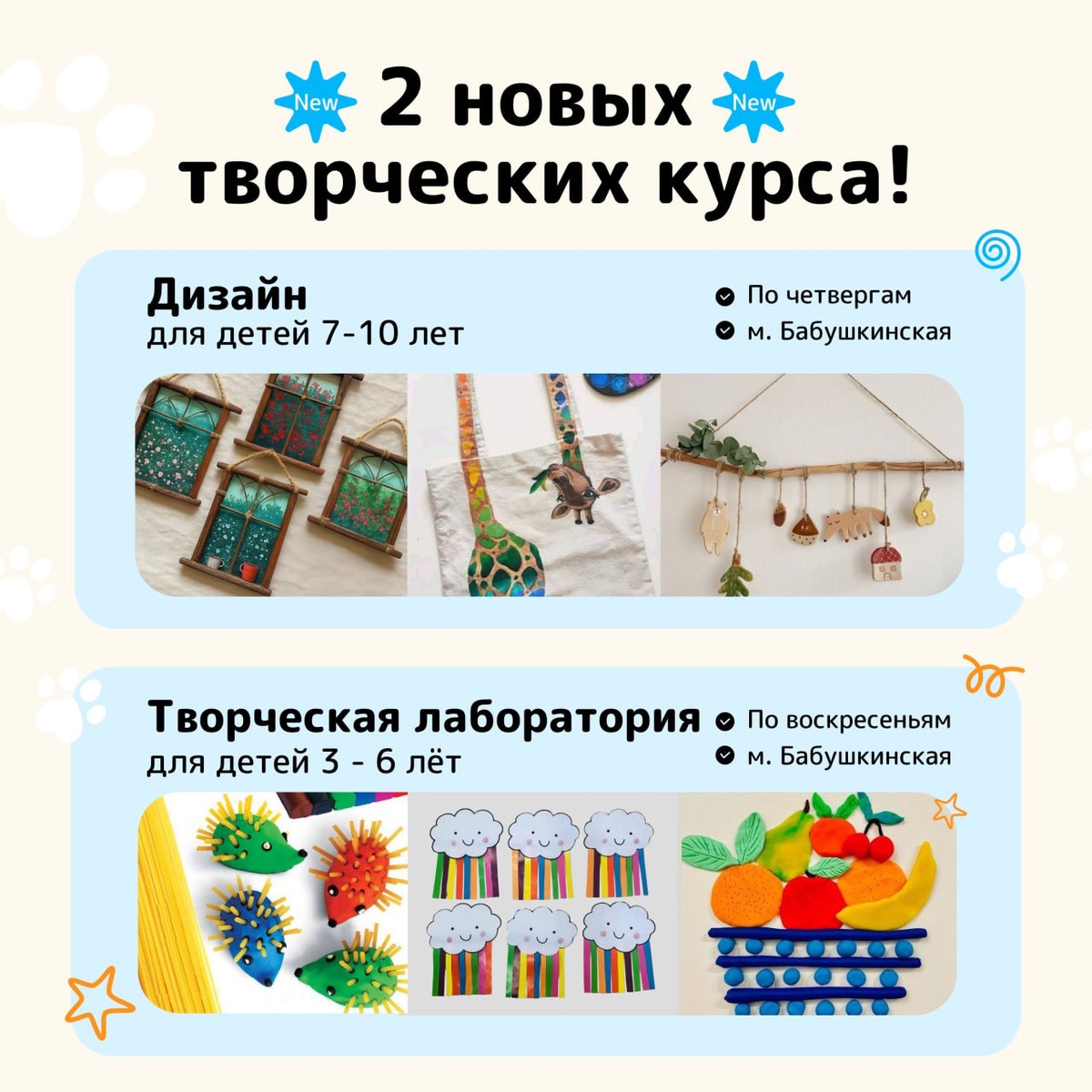 🆕🆕🆕 У нас отличные новости! 📍В центре м. Бабушкинская стартует 2 новых творческих курса! ✅ 1. Творческая студия Гильдия мастеров 7-10 лет По четвергам в 15.30 Запись По четвергам в 16.40 Запись 👉 В программе создание открыток, плакатов, украшений, предметов для интерьера, аксессуаров и др. На курсе дизайна дети: 🖌Освоят основы композиции, цвета 🖌Научатся анализировать, проектировать и создавать изделия с идеей и настроением 🖌Будут работать с различными материалами. ________________________________ ✅ 2. Творческая лаборатория для детей 3-6 лет По воскресеньям -3-4 года в 11.35 Запись -5-6 лет в 12.25 Запись 👉 На занятиях будем рисовать, работать с бумагой и клеем, лепить из пластилина, создавать поделки С помощью игры и творческих материалов будем изучать: цвета, геометрические фигуры, развивать мелкую моторику. 👩🏫 Ведущая курсов — Анисимова Кира Александровна Записывайтесь! Администраторы 📞 Позвонить +74959688647 📱 Написать в телеграм