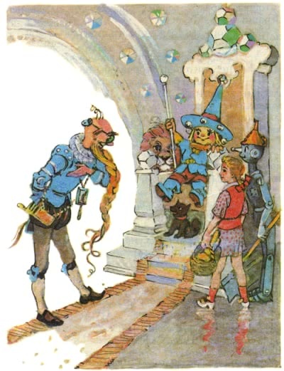 Рано утром Элли и её друзья пришли к городским воротам. Страж ворот удивился, что они снова пускаются в дальнее и опасное путешествие.