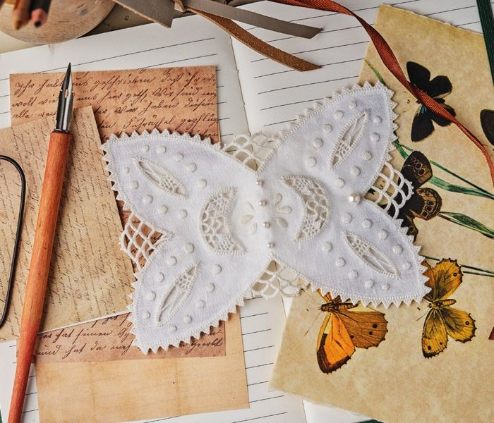 «Бабочка-игольница» от Фуми Сузуки Вышивка хедебо с ее точной работой ришелье, гладью в виде точек и ажурным кружевом является одной из самых изысканных традиций вышивки крестом в Дании. Характеризующийся скульптурными арками и изящными линиями, хедебо воплощает чистоту дизайна, в котором текстура заменяет цвет, а цвет сам становится частью декора. Историческая справка Хедебо (Hedebo) - традиционная датская вышивка, в которой выполняют, в том числе ажурные и объёмные элементы. Вышивка Хедебо зародилась в Дании в 1760-е годы. Название "Хедебо" отсылается к одноимённой области в Дании, где эта вышивка была наиболее распространена в своё время. Исконно вышивкой Хедебо датские фермеры украшали свою одежду (в основном вышивкой покрывались воротники и манжеты), а также простыни, одеяла и наволочки. К концу 19-го века своё внимание на Хедебо обратили и городские датчане, адаптировавшие вышивку к повседневной городской одежде того времени. Хедебо традиционно выполняется толстыми белыми нитками