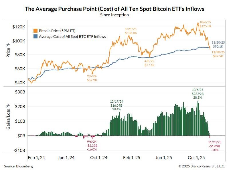 Средняя цена входа всех спот-ETF. Что это значит сейчас Сейчас мы находимся в интересной точке, и вот один из графиков, который добавляет контекста. Это средняя себестоимость покупок всех десяти спот-ETF на биткоин — и их текущая плавающая прибыль/убыток. Если коротко: цена биткоина впервые за долгое время упала ниже средней цены закупа ETF. Средняя зона входа фондов — примерно $87.5K–90K. На момент снимка ETF-инвесторы находятся примерно на –$1.7 млрд нереализованного убытка. Что важно отметить: 1. Ранее подобное мы видели только один раз — осенью 2024. Тогда фонды тоже были в минусе, рынок стоял под давлением, все спорили, “неужели пик уже был”. После чего последовал сильный импульс вверх. Но это не гарантия — просто наблюдение, как рынок вёл себя исторически. 2. Для ETF это нормальное поведение. Они покупают по рынку, по объёмам и по своим правилам. Они не ловят дни. И часто оказываются в минусе в моменты высокой турбулентности. 3. Эти данные не говорят напрямую ни “всё плохо