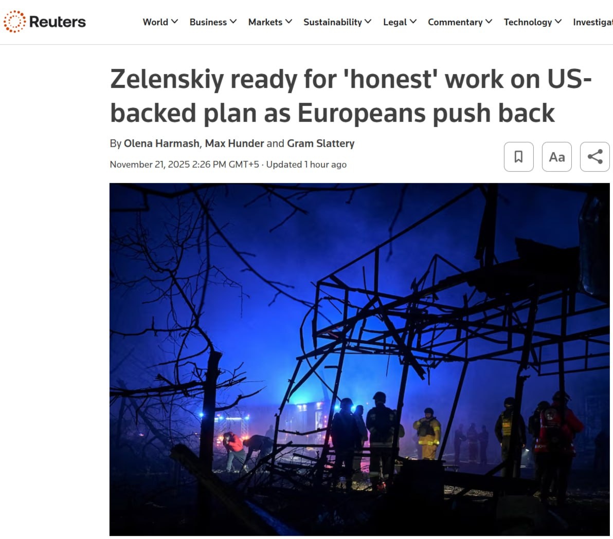 Reuters: Президент Владимир Зеленский заявил после переговоров с высокопоставленным представителем армии США в четверг, что он готов к «честной» работе с Вашингтоном над планом по прекращению войны в Украине, в то время как европейские союзники выступают против карательных уступок России. Согласно плану, поддержанному США, с которым ознакомилось агентство Reuters, от Киева потребуется отказаться от всего Донбасса и значительно сократить численность вооружённых сил. Союзники Украины уже давно считают эти условия равносильными капитуляции. «Этот план был составлен сразу после обсуждения с одним из самых высокопоставленных членов администрации президента Зеленского, Рустемом Умеровым, который после внесения нескольких изменений согласился с большей частью плана и представил его президенту Зеленскому», — сообщил высокопоставленный представитель США. В офисе Зеленского заявили, что Дрисколл представил ему план только в четверг. Несколько источников сообщили агентству Reuters и другим СМИ