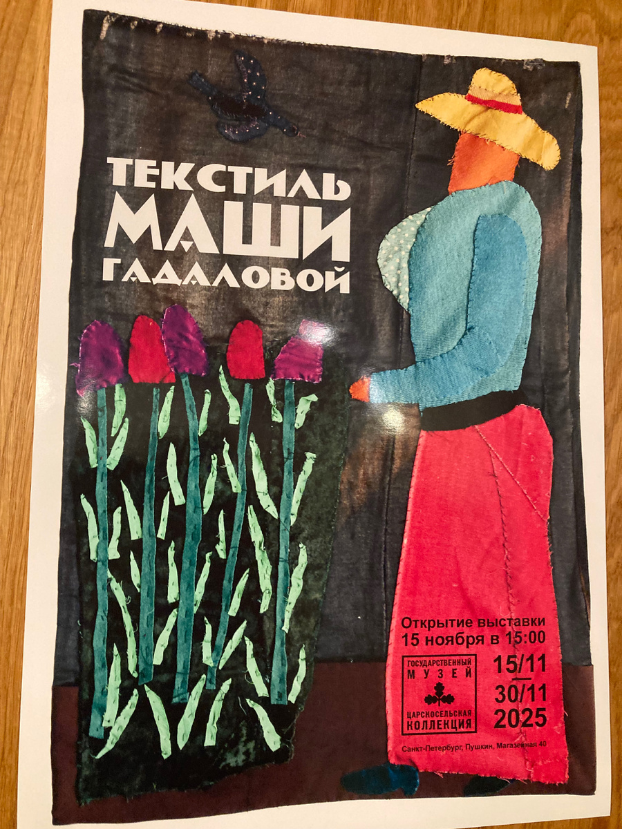 В музее «Царскосельская коллекция» такая вот милая выставка. Картины из лоскутков, разных по структуре тканей, пуговиц, и все это складывается в некий уютный теплый мир. Мне он близок и понятен.