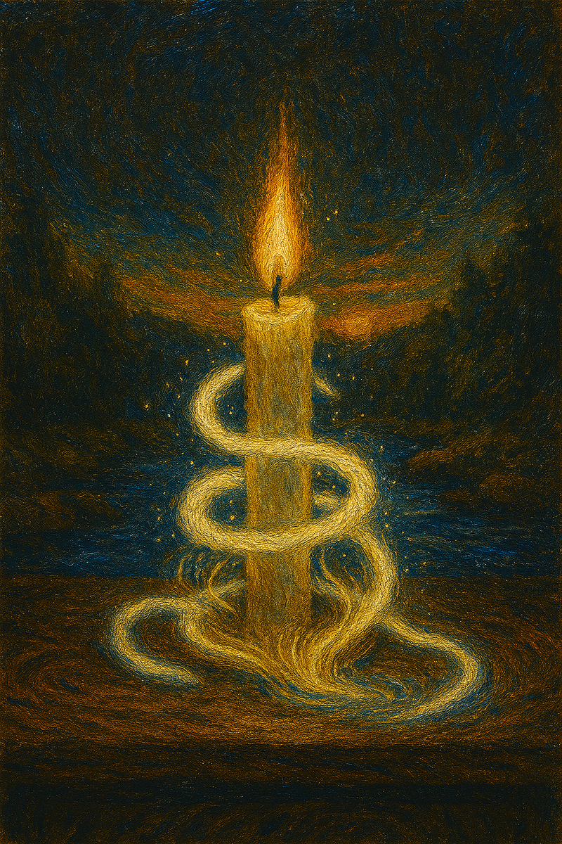Возьмите кусокъ прочной бѣлой нити двумя руками за ее концы. Потяните ее въ разныя стороны изо всѣхъ силъ, представляя, что сила вашего желанiя вливается въ веревку. Послѣ этого обмотайте веревку вокругъ свѣчи. Свѣчу подожгите и дайте ей прогорѣть до конца. Объединенные огарокъ свѣчи и нити храните въ качествѣ талисмана исполненiя желанiй.