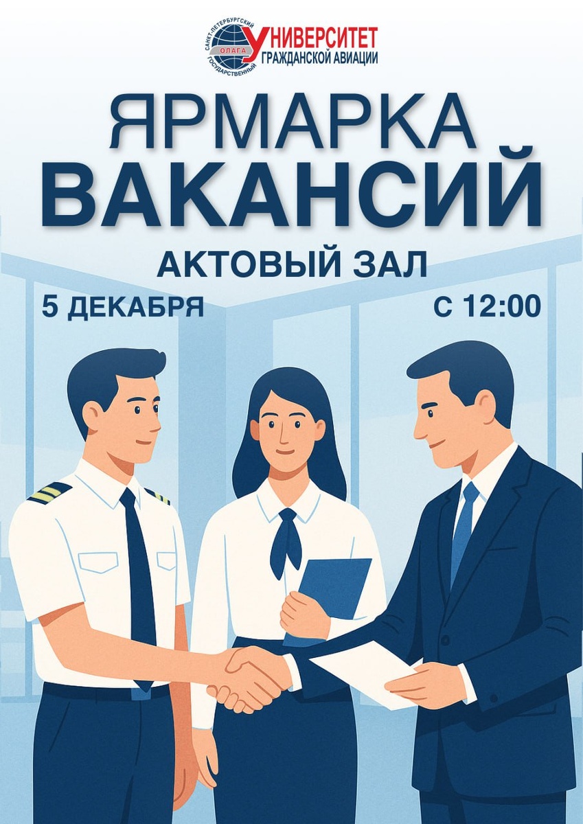 ✈️ Приглашаем студентов выпускных курсов на «Ярмарку вакансий» Университет посетят представители более 25 авиапредприятий, среди которых АО «Авиакомпания «Россия», ООО «Воздушные ворота Северной столицы», S7 Airlines, ФГУП «Госкорпорация по ОрВД» и другие ведущие организации отрасли. ✅ Вы сможете напрямую пообщаться с будущими работодателями, узнать все об актуальных вакансиях и требованиях к молодым специалистам, обсудить перспективы трудоустройства и задать все интересующие вопросы. Сделайте первые шаги в карьеру. Ждем вас на «Ярмарке вакансий» 5 декабря в 12:00 в актовом зале СПбГУ ГА!