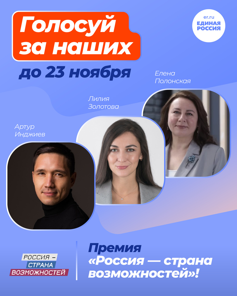 Поддержи наших! До 23 ноября проходит народное голосование Премии Президентской платформы «Россия — страна возможностей». В числе финалистов в номинации «Служение и созидание» есть представители Единой России. Каждый может поддержать финалистов и повлиять на итоговый результат!