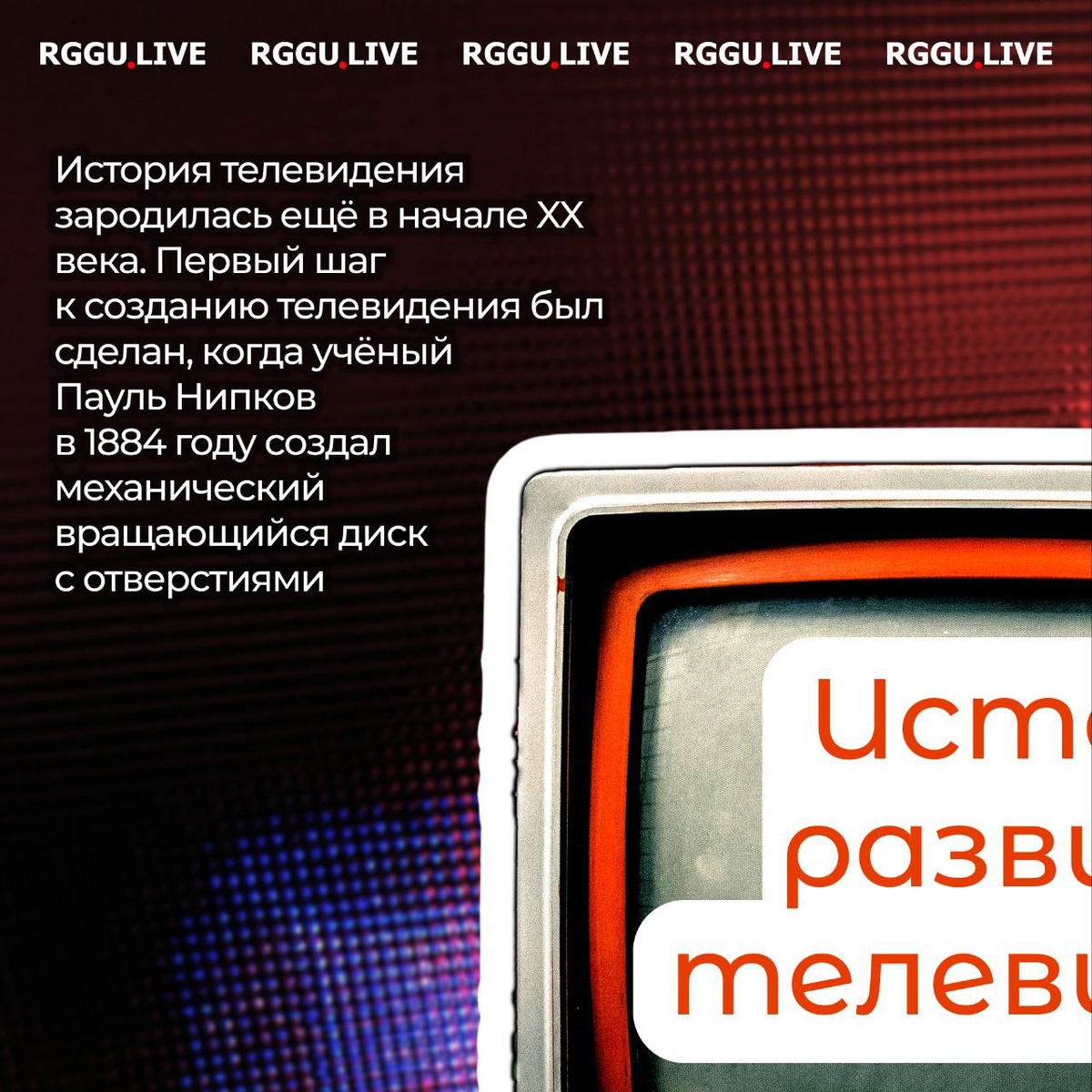 📺 Каким было телевидение прошлого? 💬 21 ноября во всём мире отмечают День телевидения 📆 В честь этой даты команда RGGU.LIVE подготовила карточки с интересными фактами об истории развития ТВ 👀 Скорее листай карточки, чтобы узнать новое о появлении телевидения! ✍️ Виктория Лукина, 2 курс ФЖ 🎨 Никита Целовальников, 2 курс ФЖ ⚪ Подписывайся на RGGU.LIVE #РГГУ #СтудентРГГУ