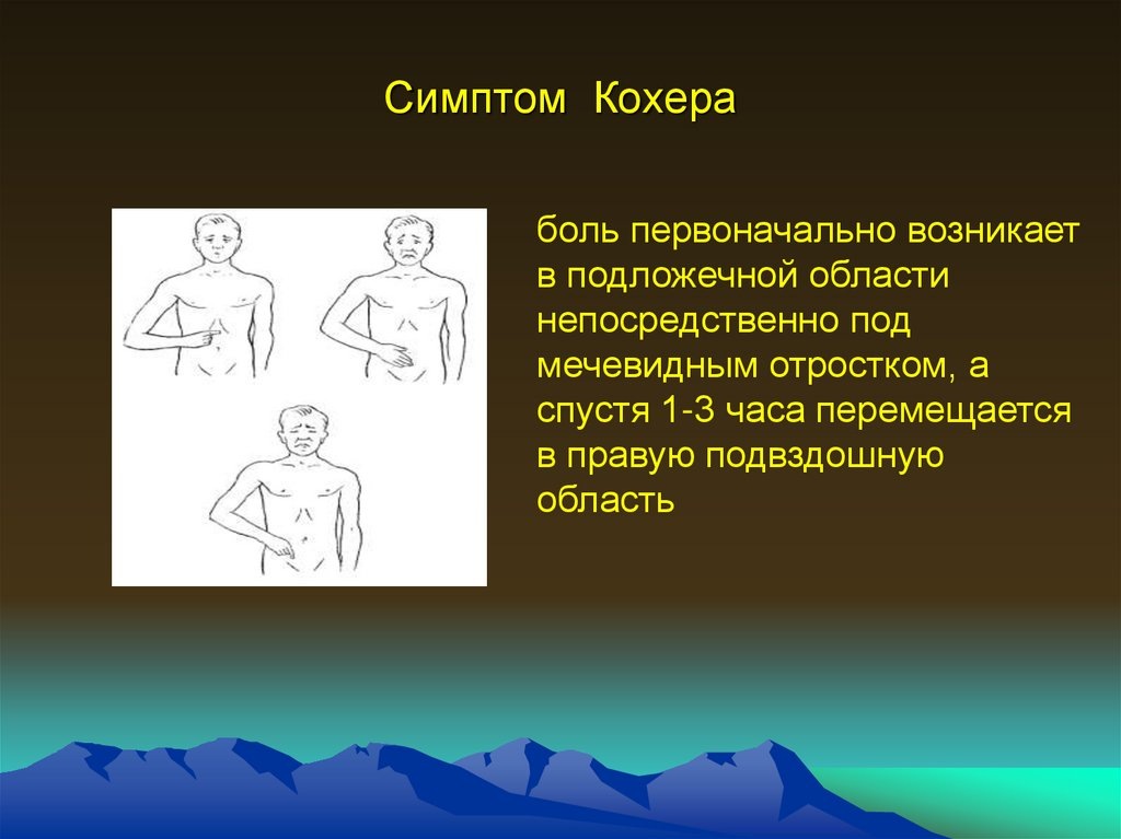 СИМПТОМ КОХЕРА заключается в появлении боли в подложечной области непосредственно под мечевидным отростком, а спустя 1-3 часа перемещается в правую подвздошную область. Симптом появляется на самых ранних этапах развития болезни, и если вовремя его отследить, можно обезопасить себя от нежелательных последствий и осложнений.