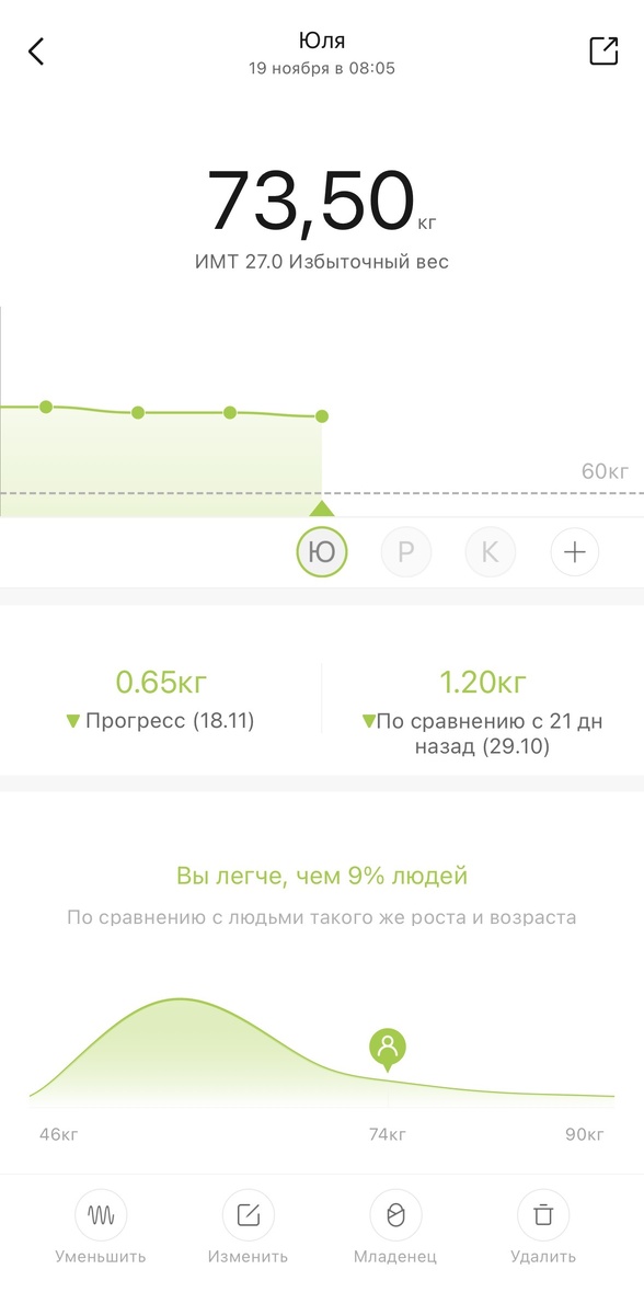 Приветствую вас на моем канале. Меня зовут Юля. Мне 34 года. Я худею с 97 килограмм. Моя цель 65 килограмм. Я худею на подсчете калорий. На данный момент я сбросила уже больше 20 килограмм. Я не беру свой метод похудения за рекомендацию для всех. У каждого своя физическая активность и норма калорий, аллергии и пищевые непереводимости. Фото тарелок это то, чем я действительно питаюсь: как пример, что можно худеть и на обычной еде, которую вы готовите для всей семьи. Плюс на моем канале вы найдете много интересных и простых рецептов. Мой канал это мой личный дневник. Но я всегда рада новым знакомствам и открыта для общения и диалога. Здесь не место для конфликтов и нецензурной лексики. Уже давно я пользуюсь умными весами. Они, согласна описанию, измеряют вообще все: и имт (индекс массы тела), и воду, и костную массу и жир. Но верить им или нет. Вот в чем вопрос. По показаниям весов получается у меня 38,5 процентов жира. А если взять другой расчет, то 31,4. Получается очень большая разн
