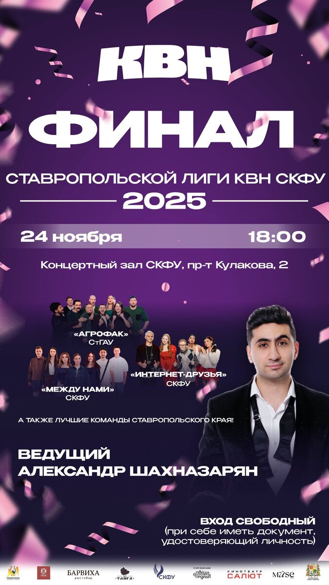 ФИНАЛ СЕЗОНА КВН: ВСЁ РЕШИТСЯ В КОНЦЕРТНОМ ЗАЛЕ СКФУ ⚡️ Главный КВН-баттл этого семестра состоится 24 ноября — именно в этот день станет известно имя чемпиона сезона-2025 На одной сцене соберутся телевизионные команды и сильнейшие коллективы вузов Ставрополя, Пятигорска и Новоалександровска. Готовься к вечеру, который определит, кто заберёт чемпионский кубок 🔻Когда: 24 ноября в 18:00 🔻Где: Концертный зал СКФУ (пр. Кулакова, 2) Вход свободный — не забудь студенческий или паспорт 🌷 Ставь напоминалку в телефоне и готовься болеть за своих. Увидимся в эпицентре юмора! #ЛигаКВНСКФУ #КВНСКФУ #СКФУ #Студенчество #ЧемпионатКВН #Анонсы_СКФУмедиа 🔵 Подписаться