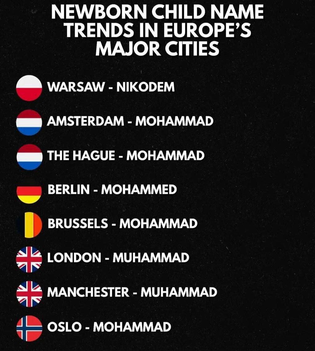 ⏺Самые популярные имена новорожденных в европейских столицах. Только одна Варшава заимела славянское имя, а не кишлачную отрыжку раннего средневековья. В России пока что в одном ХМАО подобное присутствует. ✅ ПЕРВЫЕ НОВОСТИ 🇷🇺