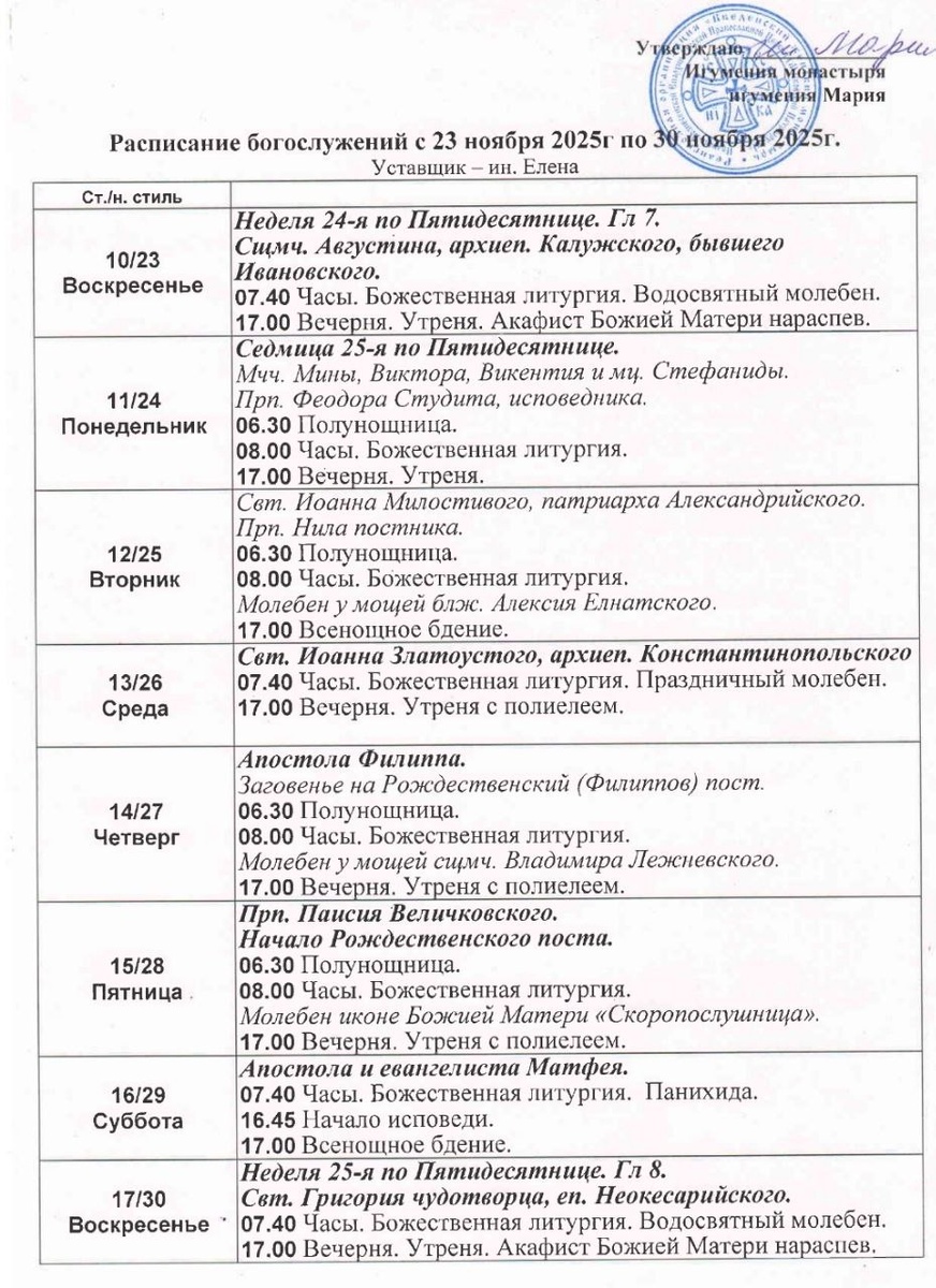 23-30.11. Расписание богослужений в Введенском женском монастыре г. Иваново