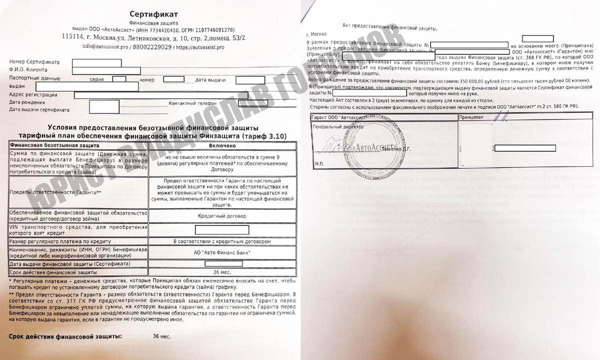 ООО «АвтоАссист»: возврат денег за безотзывной сертификат финансовой защиты