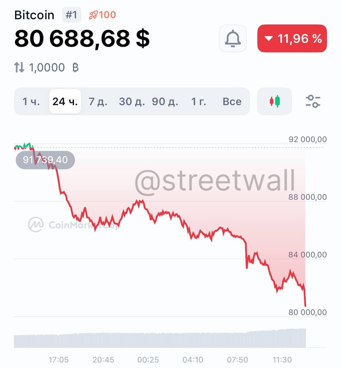 Биткоин упал до 80 000 долларов. Курс биткоина снизился до отметки в 80 000 долларов, что стало значительным снижением. Инвесторы сейчас находятся в ожидании дальнейших изменений на рынке. ────────── ⚡️Важные новости – без лишнего шума!⚡️ Подпишись на канал и получай только суть: оперативно, чётко, по делу! 👉 ИнфоСплетник | @infospletnik