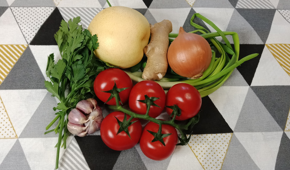 Полученные томаты кимчи станут прекрасным дополнением ко многим блюдам. Они прекрасно подойдут к мясным и рыбным продуктам, придадут пикантности гарнирам вроде картофельного пюре или гречки. Этот оригинальный способ подарит новые вкусовые ощущения даже самым искушенным гурманам. Ингредиенты: Помидоры – 5 шт. Груша – 100 грамм Лук репчатый – 100 грамм Лук зеленый – 50 грамм Имбирь – 10 грамм Петрушка – 30 грамм Чеснок – 10 грамм Масло растительное – 2 столовые ложки Уксус яблочный 6% - 2 столовые ложки Соевый соус – 3 столовые ложки Сахар – 1 чайная ложка с горкой Чили перец молотый – пол чайной ложки Паприка молотая – 1 чайная ложка Соль – по вкусу Приготовление: Подготавливаем все ингредиенты, очищаем от всего лишнего и промываем под водой. Помидоры берем вкусные и плотные. Со стороны плодоножки при помощи ножа делаем крестик (при этом помидор разрезаем до половины). Затем небольшим количеством соли натираем помидоры (соль добавляем по вкусу, кто-то любит более соленое, кому-то доста