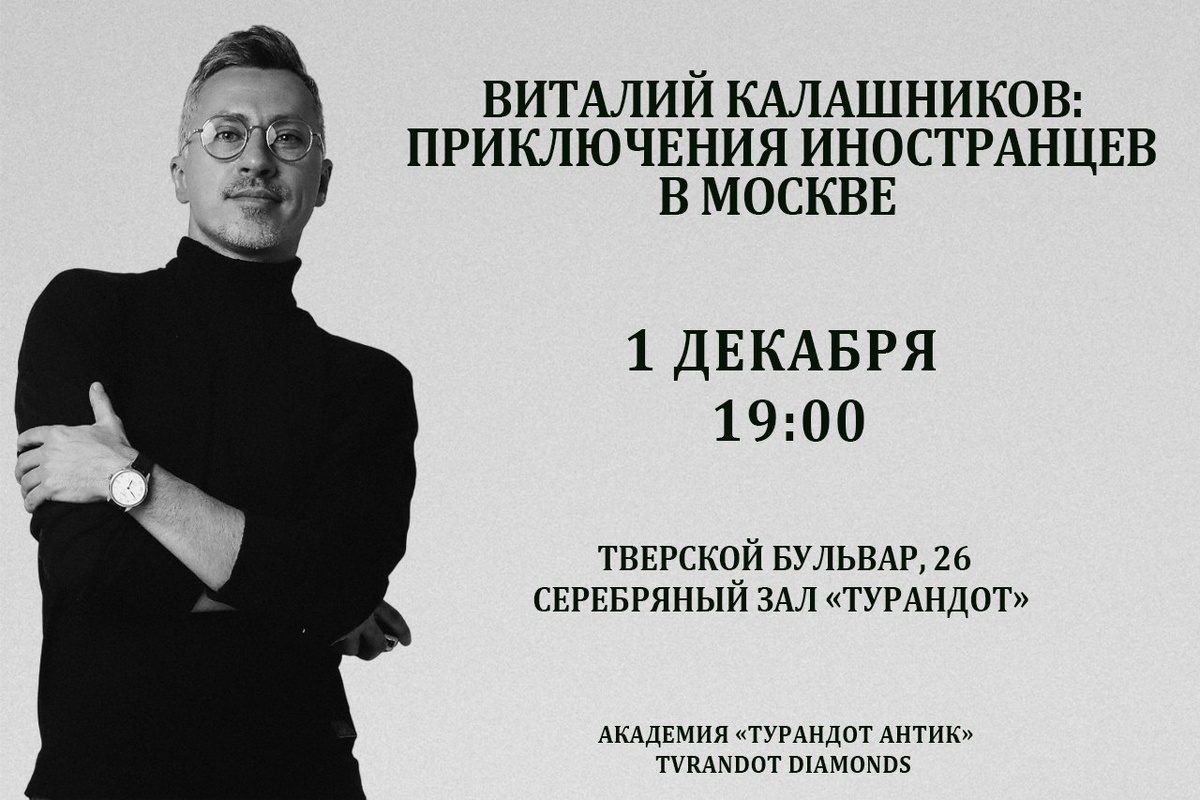 Академия «Турандот Антик» совместно с Tvrandot Diamonds приглашает провести зимний вечер, погрузившись в истории о невероятных приключениях иностранцев в Москве. Вашим гидом станет Виталий Калашников – историк, москвовед, аккредитованный гид и ведущий телеканала «Москва 24». Подробнее о мероприятии