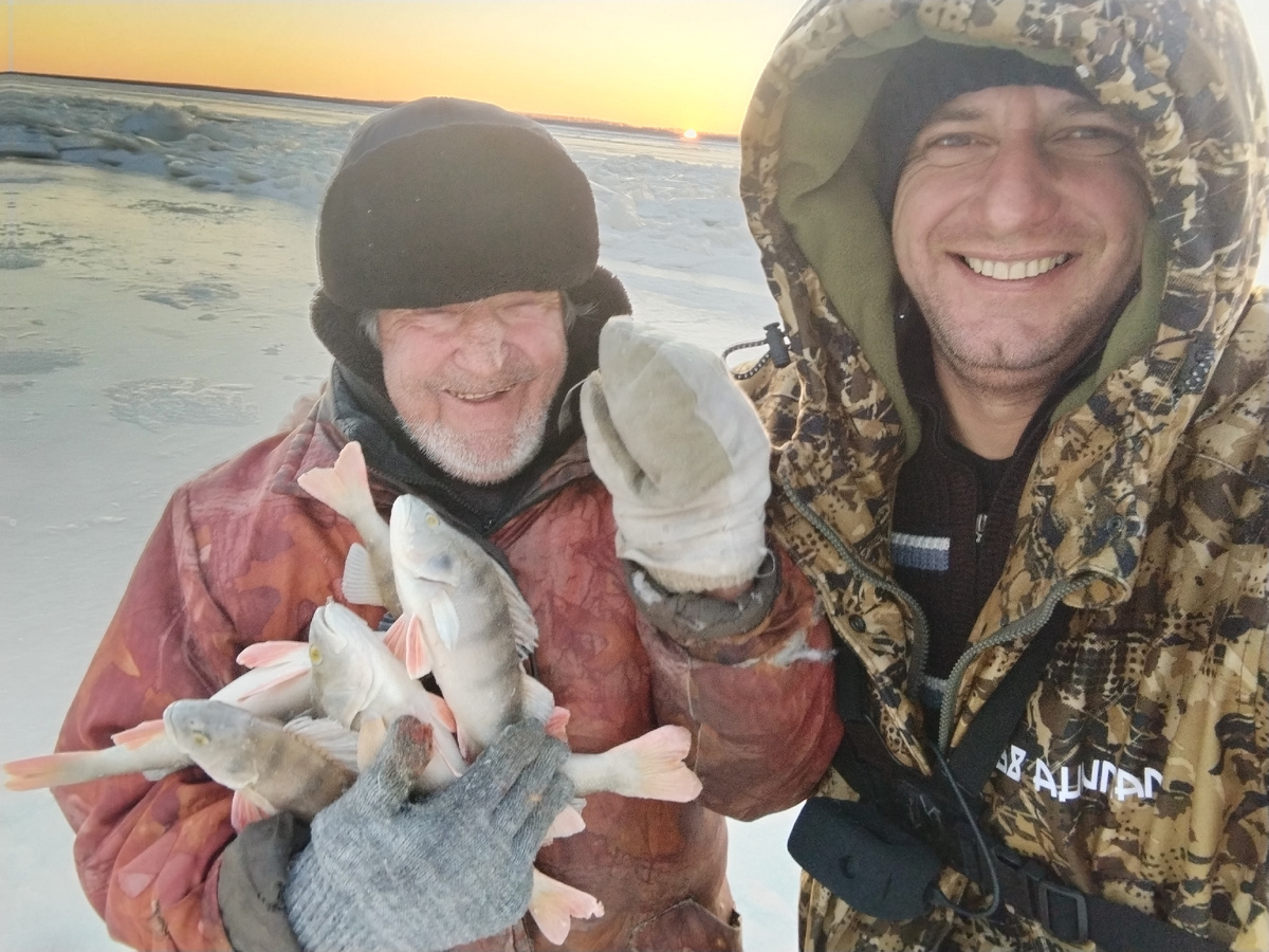 Добрый вечер друзья. Сегодня открывали первый лёд на Оби. На улице -8, но очень сильный ветер, на рыбалку мы отправились втроём я, Дед и Николай. Я приехал искать окуня поэтому начал с балансира, а дед с Николаем начали с джига. Буквально на четвёртой лунке начал поклёвывать окунь хоть и не крупный но всё-же, и довольно быстро закончился удалось поймать около 10 штук и потом одалел щурогай. Часа 3-4 нудного поиска и нескольких десятков отпущенных щурят, проскакивали штучные окуни, а хотелось найти окуня в количестве. Николаю надоело ловить и отпускать щючек и он уехал домой, а я решил ещё пройти ниже по течению зная что в этом месте есть и свалы и коряги, кочки, корни, ступеньки в общем дно в этом месте самый настоящий клондайк для полосатых тем более летом тут хорошо ловится окунь, остаётся только найти. И как говорится кто ищет тот найдёт🦈🎣, напоролся на раздачу полосатых. Кое как докричался до деда, чтобы и он половил окуней.Клёв был на столько шикарный что удочка не выдержала