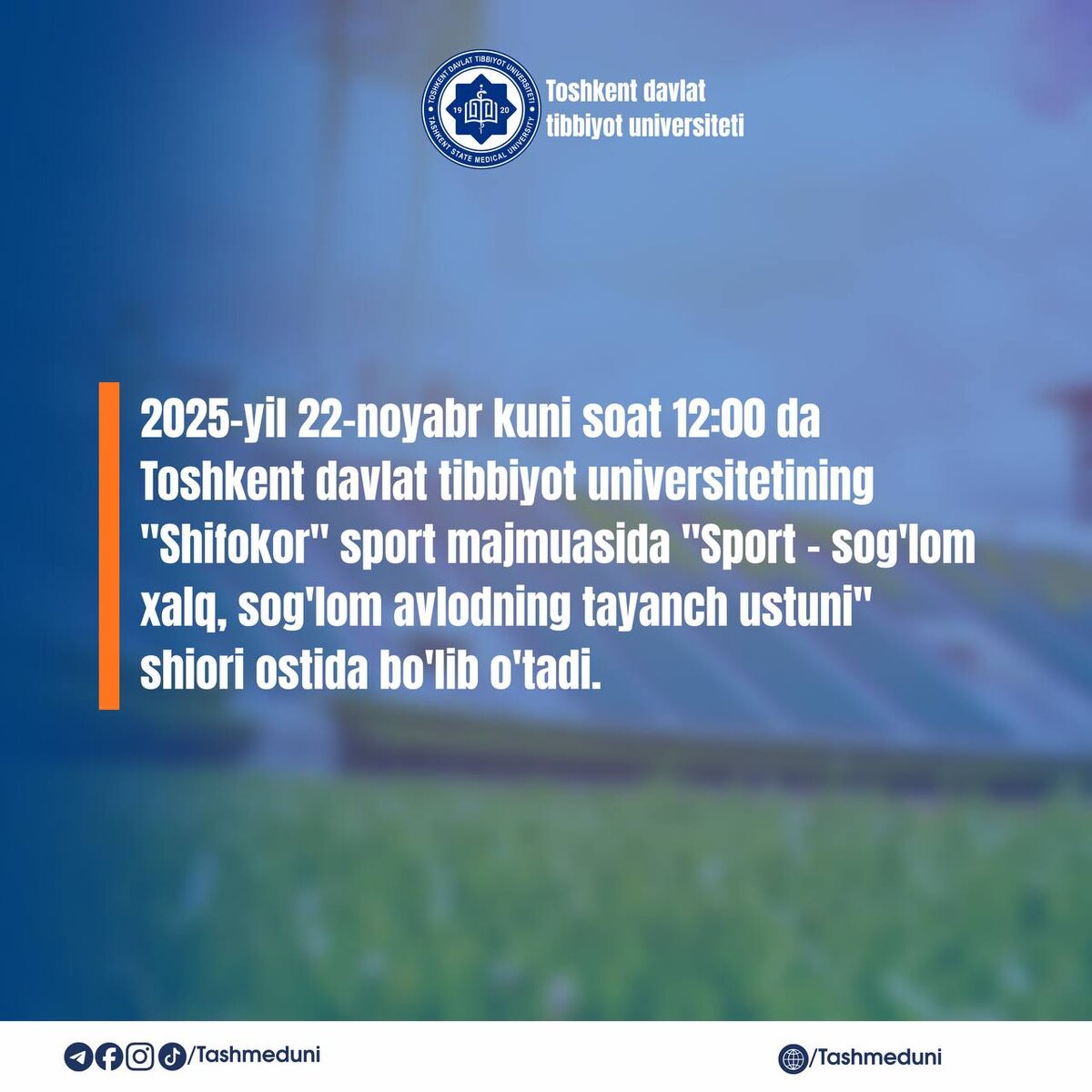 💬Toshkent davlat tibbiyot universitetida Sport bayrami o‘tkaziladi ➡️ 2025-yil 22-noyabr kuni soat 12:00 da Toshkent davlat tibbiyot universitetining “Shifokor” sport majmuasida “Sport — sog‘lom xalq, sog‘lom avlodning tayanch ustuni” shiori ostida keng ko‘lamli Sport bayrami bo‘lib o‘tadi. ➡️ Tadbirda Oliy ta’lim, fan va innovatsiyalar vazirligi, Sport vazirligi, Milliy olimpiya qo‘mitasi hamda respublikaning turli oliy ta’lim muassasalari vakillari, professor-o‘qituvchilari va talaba-yoshlari ishtiroki rejalashtirilgan. ➡️ Bayram dasturida: 🔹Tabrik nutqlari 🔹Sport musobaqalari 🔹Sport paradi 🔹Konsert dasturi 🔹12 ta yo‘nalish bo‘yicha Talabalar sport ligasi musobaqalariga start berish marosimi 🔹“Besh tashabbus” olimpiadasi g‘oliblarini taqdirlash tantanasi kabi qator tadbirlar o‘tkaziladi. ➡️ Tadbirda ishtirok etish uchun universitetning barcha professor-o‘qituvchilari, xodimlari, talaba-yoshlari hamda sport ixlosmandlari taklif etiladi. ✅Rasmiy sahifalarimiz: Telegram | Fa