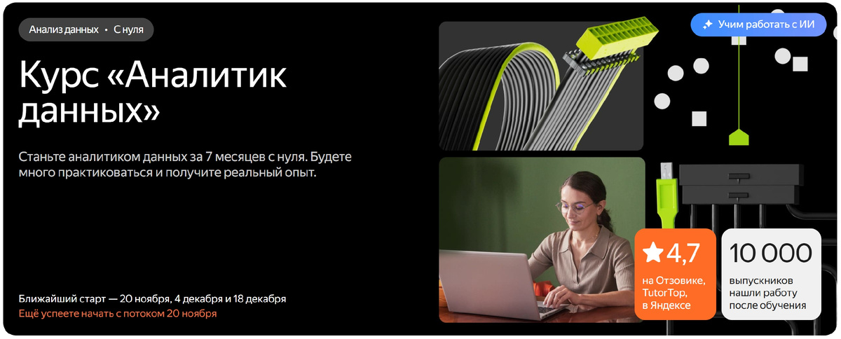 Онлайн-курс «Аналитик данных» от Яндекс Практикума предназначен для обучения с нуля и рассчитан на тех, кто хочет освоить профессию аналитика данных.