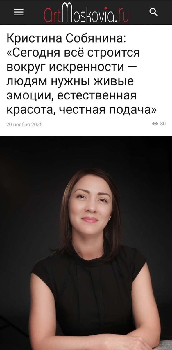 Сегодня всё строится вокруг искренности. Ушло время глянцевой недосягаемости — людям нужны живые эмоции, естественная красота, честная подача. Источник: Медиагруппа АртМосковия https://artmoskovia.ru/kristina-sobyanina-segodnya-vsyo-stroitsya-vokrug-iskrennosti-lyudyam-nuzhny-zhivye-emoczii-estestvennaya-krasota-chestnaya-podacha.html