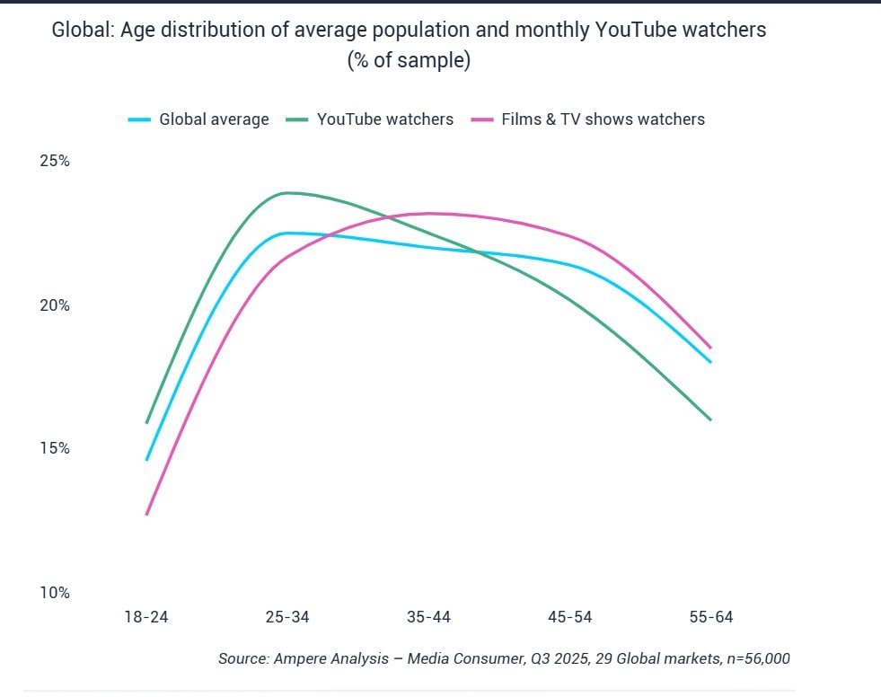 #продюсер Все, кому казалось, что YouTube — это площадка «дети смотрят блогеров, пока взрослые пьют чай рядом», — пора обновить картину мира. Посмотрела свежий отчёт Ampere Analysis - цифры по 56 000 взрослым зрителям. И там интересное: 85 % всех пользователей интернета открывают YouTube каждый месяц. Но главная деталь не в охвате. Главная — в том, что теперь смотрят. Около 18 % пользователей — почти каждый пятый — идут на YouTube не за роликами, а за полнометражными фильмами и сериалами. И двигатель этого сдвига (сорян за тафтологию) — возрастная группа, которую индустрия почему-то продолжает считать «второстепенной». 35–64 лет. Те самые, которые по идее должны сидеть у телевизора или максимум в подписке какого-нибудь стриминга. А они берут и опять перестраивают глобальные привычки. Семейный просмотр теперь тоже на YouTube. Домохозяйства с детьми туда же: родители, бабушки, дедушки — все смотрят вместе. И вот это «мультигенерационное» ощущение — когда один экран собирает три разны
