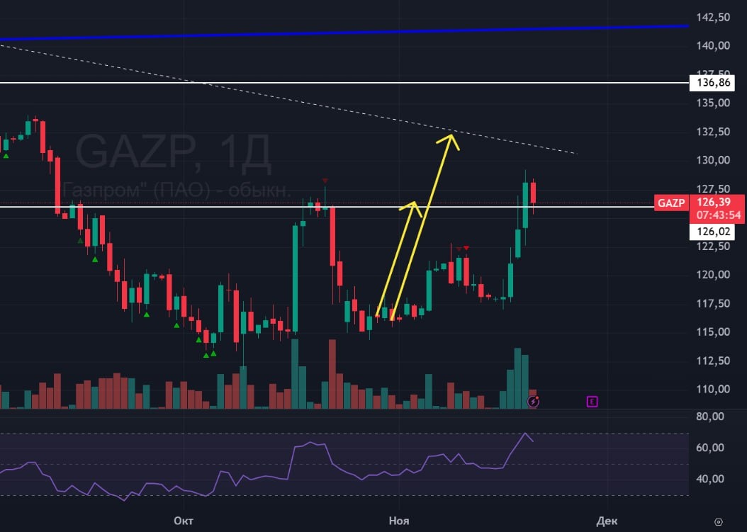 В ответ на пост ⛽️ Газпром 🟢 В прошлом посте говорил о клине в Газпроме, который можно было отработать, и его полностью выполнили. Сейчас перед нами уже сформировалась фигура двойного дна. Прибита вверх линия 126. Задача дня удержать поддержку и закрыться над ней. Следующее сопротивление - пунктирная нисходящая линия. Она будет встречать на уровне 130 руб. На дневке уже почти в зоне перекупленности, но если будет резинка вверх из-за переговоров, то перекупленность эта не помешает никак. 🟢 а на недельном тайм-фрейме еще ПГИП. Если пробьем наклонку, то идем на высоту всего накопления, что под желтой линией. 🚗 Ну я все еще супербык. Жду всю эту историю отработку, и примерно на 3100 по индексу выхожу из лонгов. чтобы оглядеться. #ГАЗПРОМ #GAZP #GAZPF #bogdanoffinvest