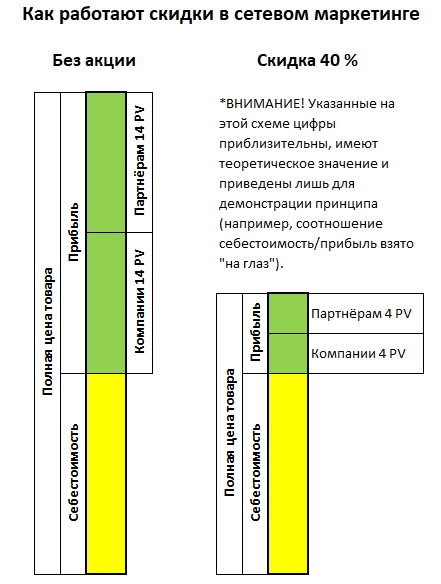 Этот пост будет понятен в основном уже готовым сетевикам 😁 Нарисовал схему, объясняющую, как работают скидки в сетевом маркетинге. Часто у партнёров возникают вопросы - почему во время акций уменьшаются PV (баллы, на основании которых потом рассчитывается вознаграждение партнёров). Дело в том, что PV - это механизм разделения прибыли между компанией и партнёрами (сетью партнёров). Когда компания делает скидку на товар, прибыль с этого товара уменьшается. Соответственно, меньше становятся часть, получаемая самой компанией и часть, выплачиваемая партнёрам. А это как раз и регулируется с помощью PV 👌 На картинке показан общий принцип уменьшения PV в случае объявления акции на товар. Себестоимость товара не меняется – значит, прибыль от него уменьшается на размер скидки. Нужно соответственно пересчитать PV, чтобы разделить прибыль между партнёрами и компанией так, чтобы все остались в плюсе. Вот и всё 👍