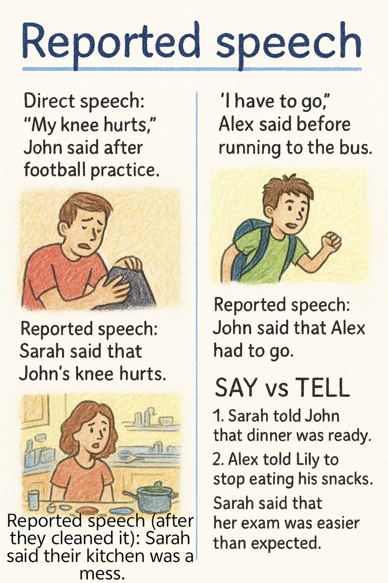 #️⃣#️⃣#️⃣ O’Connor Grammar: Reported Speech 2: When the Situation Changes (and SAY/TELL Rules) 🗣️➡️📘 #️⃣ Today we continue our journey into reported speech — the moments when the O’Connor family retells each other’s stories, news, and complaints. This time we’ll focus on two big ideas: 1️⃣ When we do and do not change the verb tense. 2️⃣ How to use say and tell correctly. A little grammar, a little chaos — just how the O’Connors like it 😄. #️⃣ 1. When we DO NOT change the tense 🔄❌ If the situation is still true at the moment of reporting, we can keep the original tense 🔹 Direct speech: “My knee hurts,” John said after football practice. 🔹 Reported speech: Sarah said that John’s knee hurts. Сара сказала, что у Джона болит колено (и оно действительно всё ещё болит). B Вut we can also change the tense — both versions are correct if the situation is still true. #️⃣ 2. When we MUST change the tense 🔄✔️ If the situation has changed, finished, or is no longer true, we swit