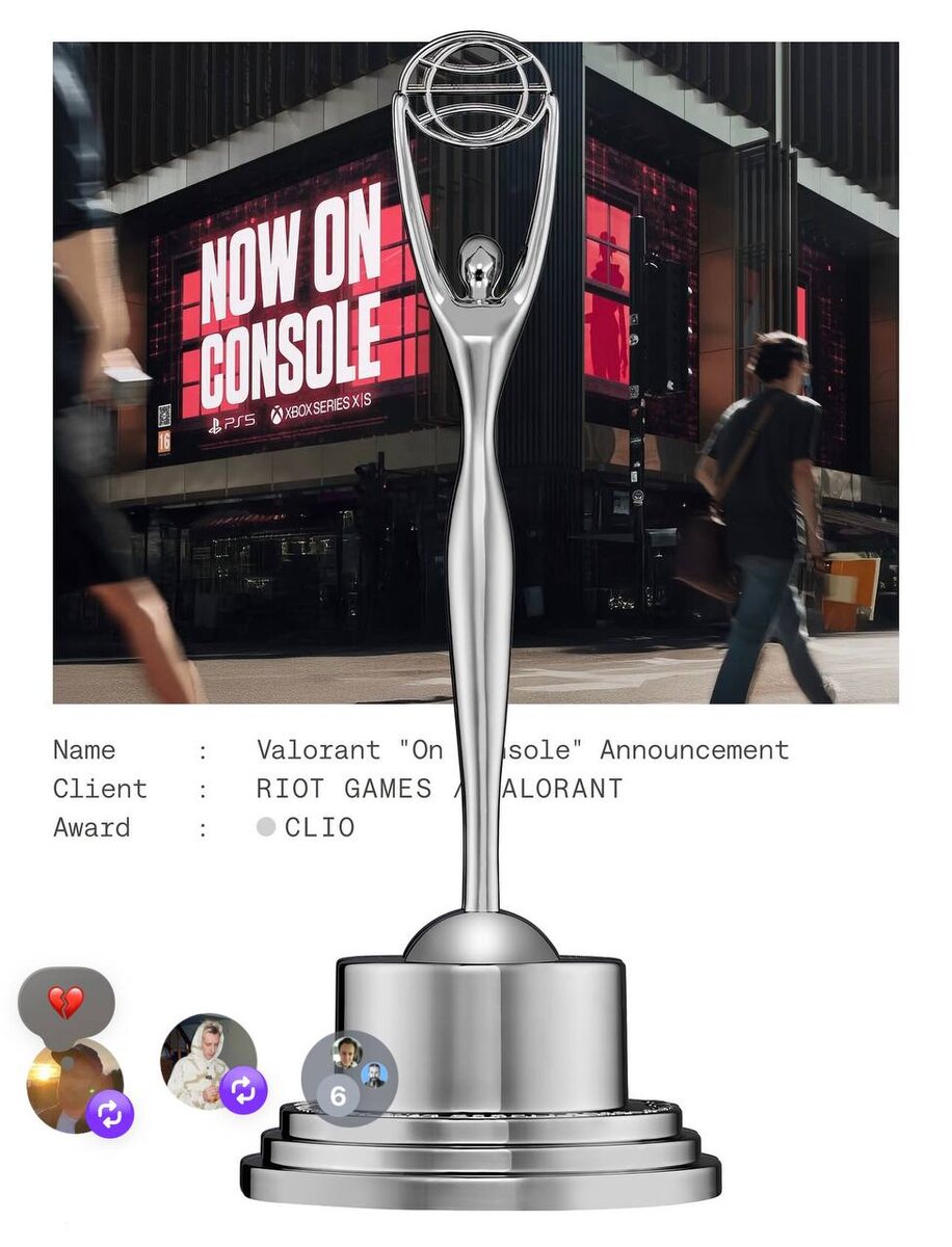 Вместе с коллегами из PLaysense получили ещё один CLIO, тот что Оскар, но в рекламе. Серебряный 🩶 В этот раз, побыл режиссером и креатором кампании по запуску PC-версии Valorant. Классно было. И проект зачетный вышел. Хорошо что рассмотрели Link to the win