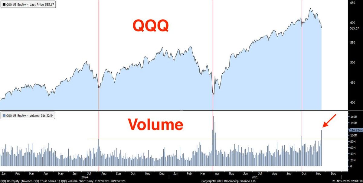 Инвесторы, хочу обратить ваше внимание на один любопытный сигнал с традиционного рынка, который многие в крипте вообще игнорируют. Сейчас по SPY и QQQ прошли самые большие объёмы торгов со времён апрельского обвала. И если вы давно наблюдаете за рынками, то знаете, что такие всплески ликвидности появляются не в моменты эйфории, а ближе к капитуляции — когда рынок резко перераспределяет риск. Почему это важно нам? Потому что крипта всё ещё живёт внутри глобального цикла ликвидности. Если на фондовом рынке начинается зачистка позиций, мы видим резкие движения и повышение оборотов — это чаще всего означает две вещи: 1. Рынок сбрасывает перегруженные позиции. 2. Покупатели с большим капиталом начинают постепенно отбирать активы у слабых рук. Это не бычий сигнал сам по себе, но и не медвежий. Это — маркер того, что формируется сильный поворотный участок. А вот куда именно будет разворот — вверх или в боковую фазу — зависит от последующей структуры. Но факт остаётся фактом: когда объём