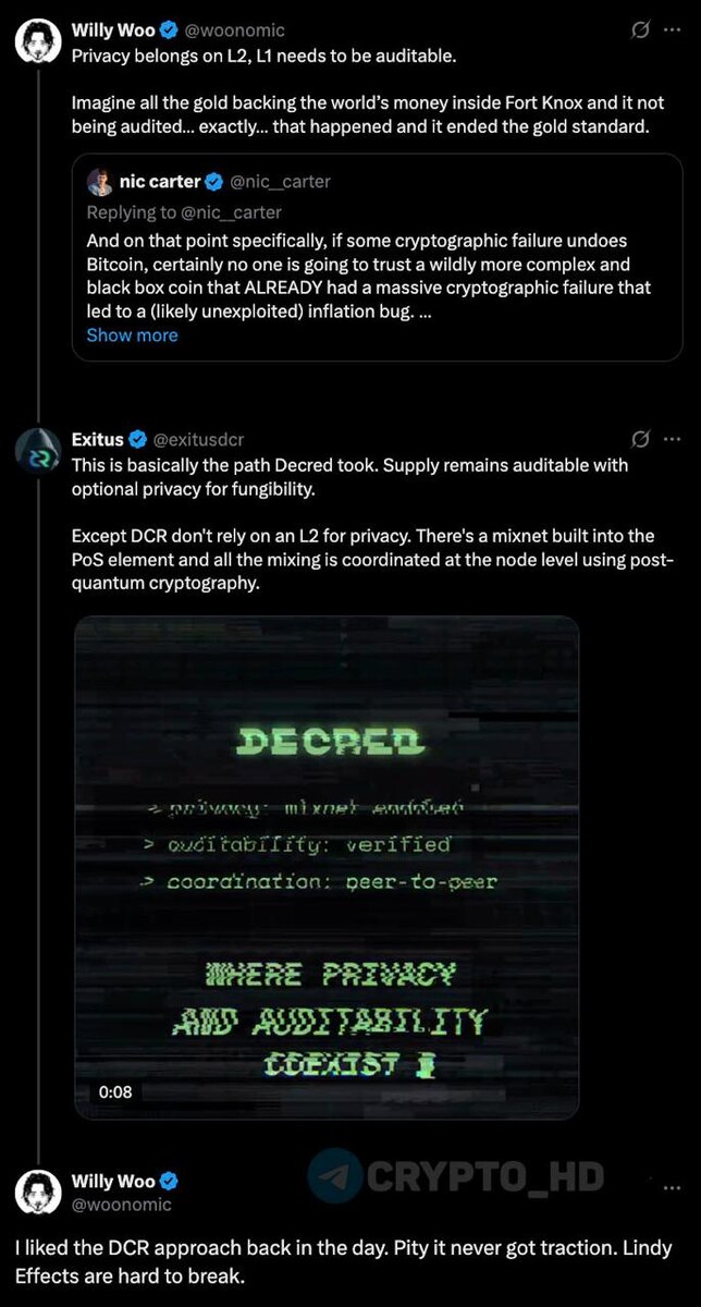 👀 #DCR Споры о приватности и доверии к сети… ➠ Willy Woo: Приватность должна находиться на уровне L2, а базовый слой обязан оставаться полностью аудируемым. Неаудируемый L1 сравним с ситуацией, когда золотой запас Форт-Нокс перестал проверяться и подорвал доверие к системе. ➠ Nic Carter: Полностью приватные монеты уступают прозрачным сетям по надежности. Инфляционные ошибки в них сложнее обнаруживать, а история Zcash (#ZEC) показывает, что shielded-транзакции неизбежно создают повышенные риски. Если Биткоин когда-либо столкнется с криптографическим сбоем, доверия к более сложным приватным монетам не останется. ➠ Комьюнити Decred: В проекте Decred (#DCR) сохранена полностью прозрачная эмиссия, но приватность доступна как опциональная функция. Она встроена напрямую в протокол через собственный mixnet и пост-квантовые механизмы, без вынесения на L2. ➠ Willy Woo: Мне в свое время нравился подход Decred. Жаль, что он так и не прижился. Эффект Линди сложно сломать. Эффект Линди – принц