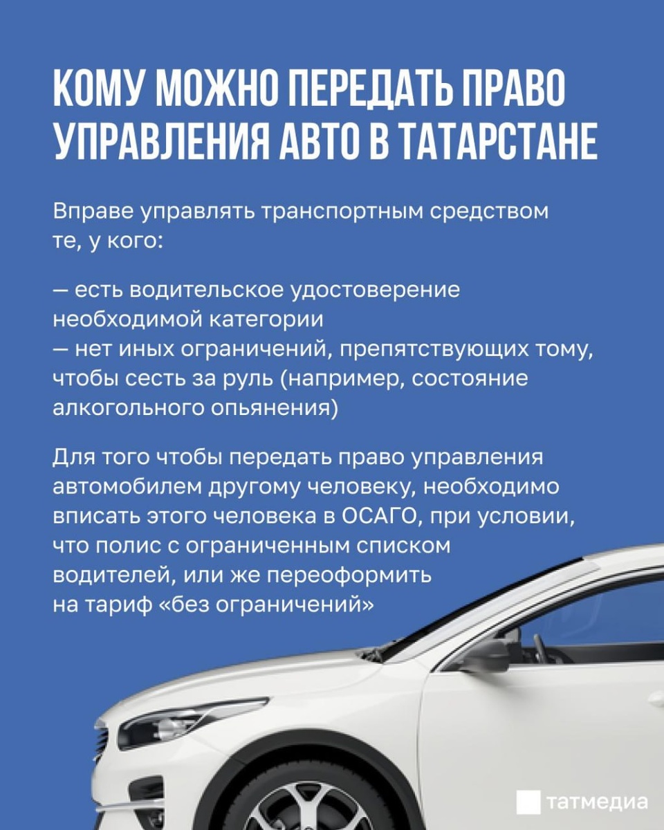 В ответ на пост 🚗❔Право управления машиной татарстанец может предоставить почти любому человеку В каких случаях это возможно и каким критериям должен соответствовать водитель – в карточке. #ПолезноеТМ @tatmediaofficial | Все каналы Татмедиа ™️ 1-й новостной MAX-канал Татарстана - подпишитесь.