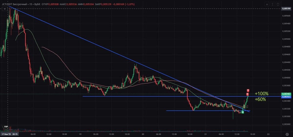 Монета JCT. Пробой тренда после разворота. 70% позиции закрыто, стоп в б/у. Профит в моменте +80%