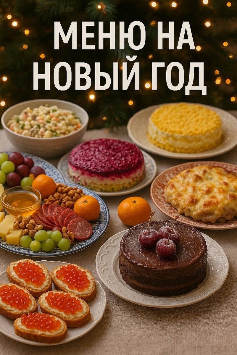 Меню на Новый год 2026 🎉 1. Селёдка под шубой: селёдка, свёкла, картофель, морковь, лук, майонез. 2. Оливье: варёный картофель, морковь, яйца, соленые огурцы, вареная колбаса (или куриное филе), зелёный горошек, майонез, соль, перец. 3. Мимоза: консервированная рыба (горбуша), варёные яйца, лук, майонез, тёртый сыр. 4. Шоколадный торт с вишней: Для теста: Яйца 6 шт., сахар 100 г, сливочное масло 150 г, миндаль молотый 75 г, какао 4 ст.л., мука 3 ст.л., крахмал 3 ст.л., ваниль по вкусу, сода Для начинки: сметана (жирная, не ниже 20%) 400 г, вишня 750 , сироп от вишнёвого варенья для пропитки, тёртый шоколад для украшения 5. Мясо по-французски: куриное филе, репчатый лук, помидор, майонез, сыр. 6. Закусочная тарелка: сыр, колбаса, виноград, мандарины, яблоки, орешки. 7. Бутерброды с красной икрой: хлеб, сливочное масло, красная икра. Что бы ещё добавили?