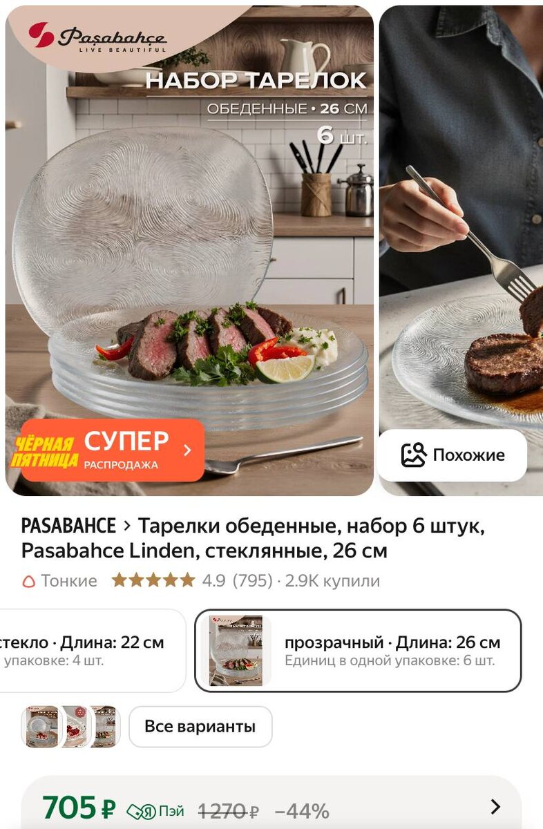 Тарелки обеденные, набор 6 штук, Pasabahce Linden, стеклянные, 26 см