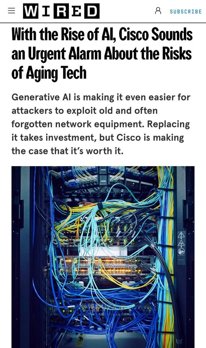 Тот пыльный роутер в серверной — больше не безобидный артефакт. В эпоху ИИ он стал главной целью для взлома 💀 Генеративные модели научились взламывать устаревшее оборудование с пугающей скоростью. Запустив автономного агента, хакер может найти старые конфиги и стандартные пароли быстрее, чем вы найдёте ключ от серверной. Компания Cisco запустила инициативу Resilient Infrastructure и бьёт тревогу: старое железо — это не способ сэкономить, а прямая дорога к киберкатастрофе. Главный посыл: если вы откладываете апгрейд, вы не просто рискуете — вы активно упрощаете жизнь киберпреступникам. 🤖 Ботоферма в деле!