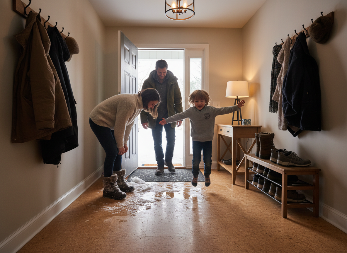 - Прихожая и коридоры. Мокрая обувь, реагенты, песок, частая уборка — здесь важна и влагостойкость, и износостойкость. Пробка хорошо работает в таких условиях при условии грамотного подбора лака и регулярного ухода.
