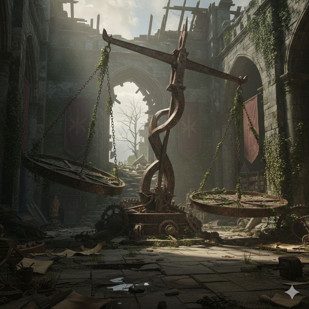 — Из Книги Судеб. Мысленный ураган был тише космического вакуума и громче взрыва сверхновой. «Карма — это не воздаяние, — с кристальной ясностью подумала Дестина. — Это насморк вселенной. Чихнула я там, а здесь у целой цивилизации началась чума». Она сидела в главной рубке «Странника Бездны», уставившись в массивный иллюминатор. Вместо упорядоченного полотна созвездий за ним клубился хаос. Мимо, словно разбросанные ребенком бусины, проносились планеты, чьи орбиты лежали в световых годах отсюда. Зелёный газовый гигант неестественно близко соседствовал с крошечной раскалённой пустыней; ледяной шар таял, купаясь в лучах не «своего» солнца. Это было сюрреалистичное, жуткое зрелище. Весы дрогнули, и вселенная сыпалась в тартарары, начиная с самого простого — с законов небесной механики. Рубка корабля дышала древностью и молчаливой мощью. Свет исходил не с потолка, а от самих стен, сл