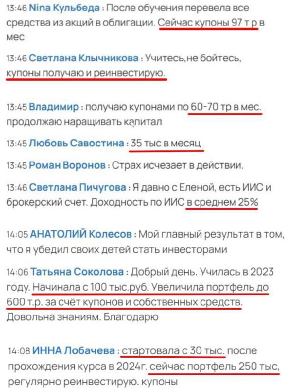Как бухгалтер Марина вышла на ренту 61'000 рублей в месяц… не меняя работу Марина — обычная женщина. Бухгалтер. Работает 5/2, отчеты, цифры, клиенты. Дом, семья, заботы. Когда она пришла ко мне, ей было 55 Сказала: — Елена, я боюсь. Вкладываться — страшно. Но ещё страшнее — доживать на 17 тысяч пенсии Мы начали с малого. Она стала инвестировать по 10'000 рублей в месяц. Без фанатизма. Без риска. Облигации + немного акций. Через 2 года — у неё уже 3'720'000 в портфеле и пассивный доход 61'000 в месяц Она улыбается: — Я даже не знала, что это возможно. Я теперь спокойно сплю 🤔 Знаете, что главное в этой истории? Не размер дохода, не проценты. Главное — она перестала бояться и начала действовать Все мои ученики начинают получать пассивный доход уже во время обучения. Сначала это небольшие суммы, которые они реинвестируют для увеличения доходности (за счет сложного процента). А затем они выходят на серьезный пассивный доход Хочется так же? Напишите мне слово «консультация» или свой