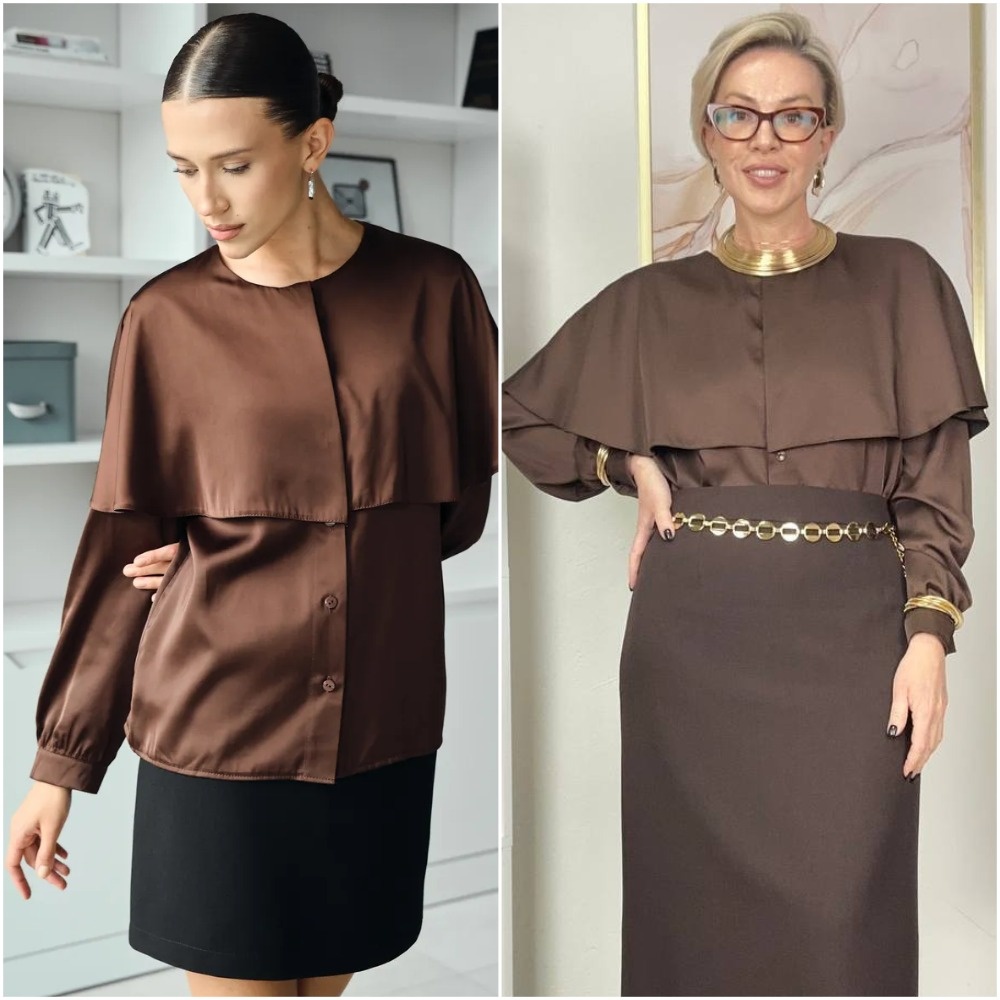 Здравствуйте, дорогие читатели! Меня зовут Ирина, я - стилист, и на этом канале показываю одежду и аксессуары с Wildberries такими, как они есть, то есть, из серии "ожидание/реальность". Мои параметры: рост 169 см, вес 67 кг, 94-74-100 ✅Основной канал: Стильно - не значит дорого! Ставьте лайк в поддержку канала, и давайте смотреть на мою сегодняшнюю покупку. Блузка Состав: 48% вискоза 52% полиэстер Размеры: 40-52 Цена: 2712 руб Коричневая блуза-кейп: элегантная многослойность Эта модель в шоколадном оттенке сочетает строгость кроя и выразительность декора. Рубашечный силуэт с застежкой на пуговицы создает классическую основу, а объемная накидка-кейп добавляет скульптурный объем. Круглый вырез и длинные рукава с манжетами подчеркивают лаконичность дизайна. Материал с преобладанием полиэстера и вискозы обладает мягкой драпировкой, сохраняя форму. Воланы плавно ниспадают от линии плеч, создавая динамичный контур без излишней тяжести. Качество исполнения проявляется в аккуратной обработке