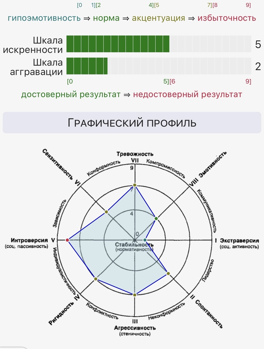 - Шкала агравации 2 → ты не приукрашивала проблемы, не пыталась казаться «психом», всё достаточно объективно.