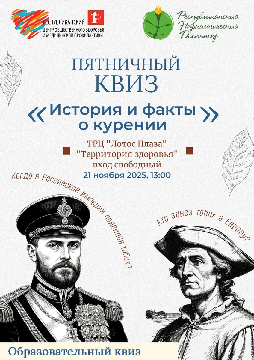 ❓Знаете ли вы, когда табак впервые появился в России? Сколько вредных веществ содержится в одной сигарете? Как никотин влияет на мозг человека? Образовательный квиз от Республиканского наркологического диспансера поможет вам разобраться в этих вопросах и узнать много неожиданных фактов о табачной зависимости и способах борьбы с ней. 📍Где: ТРК "Лотос Плаза" ("Территория здоровья", нулевой этаж, вход №2 со стороны ул.Сыктывкарская) 🕐 Когда: 21 ноября в 13:00 Готовы проверить себя? 💬Подписывайтесь на Минздрав Карелии в МАХ