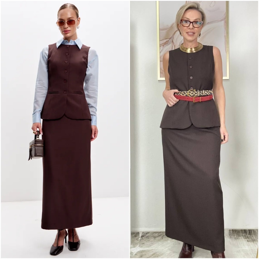 Здравствуйте, дорогие читатели! Меня зовут Ирина, я - стилист, и на этом канале показываю одежду и аксессуары с Wildberries такими, как они есть, то есть, из серии "ожидание/реальность". Мои параметры: рост 169 см, вес 67 кг, 94-74-100 ✅Основной канал: Стильно - не значит дорого! Ставьте лайк в поддержку канала, и давайте смотреть на мою сегодняшнюю покупку. Коричневый костюм: жилет + юбка-карандаш Этот комплект в шоколадных тонах объединяет две самостоятельные вещи, создающие целостный образ. Оба элемента выполнены из одинаковой костюмной ткани с добавлением эластана, что обеспечивает единство фактуры и цвета. Жилет приталенного кроя с закругленными полами создает элегантный силуэт. Пуговицы и карманы без клапанов подчеркивают лаконичность дизайна. Удлиненная линия подола позволяет носить его как с юбками, так и с брюками. Юбка-карандаш с высокой посадкой и разрезом сзади обеспечивает комфорт при ходьбе. Подкладка и молния гарантируют удобство носки. Прямой крой визуально вытягивает ф