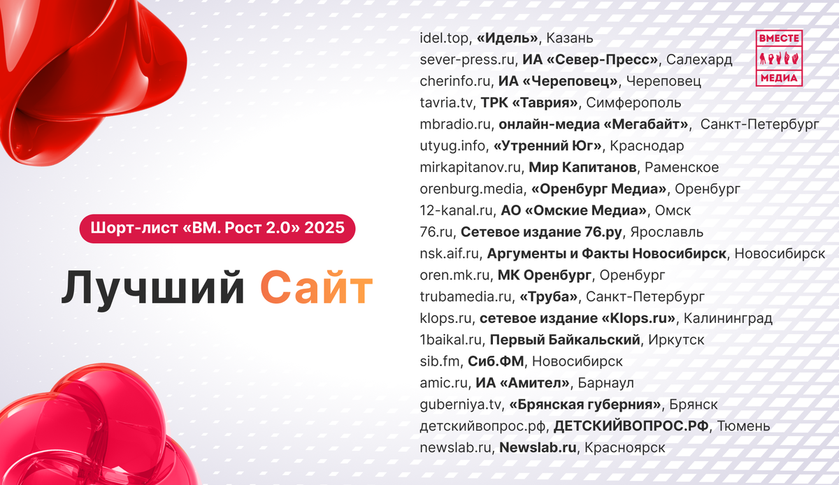 Экспертное жюри «Вместе Медиа» выбрало претендентов на победу. Поздравляем всех, кто вошел в шорт-лист! Сайт «12 канал», АО «Омские Медиа», Омск 76.RU, Сетевое издание 76.ру, Ярославль Таврия. Твоя. Родная, ТРК «Таврия», Симферополь Мегабайт Медиа, онлайн-медиа «Мегабайт», Санкт-Петербург Сайт журнала «Идель», онлайн-медиа «Идель», Казань Сайт ИА «Север-Пресс», ИА «Север-Пресс», Салехард Официальный сайт города Череповца, ИА «Череповец», Череповец Сетевое издание «Утренний Юг», «Утренний Юг», Краснодар Отраслевое СМИ «Мир Капитанов», Мир Капитанов, Раменское Перезапуск сайта «Оренбург Медиа», Сетевое издание «Оренбург Медиа», Оренбург Сайт «Клопс», Сетевое издание «Klops.ru», Калининград Сайт «Первый Байкальский», Первый Байкальский, Иркутск Сиб.фм, Новосибирск АиФ-Новосибирск, Аргументы и Факты Новосибирск, Новосибирск МК в Оренбурге, Оренбург Онлайн-издание «Труба», «Труба», Санкт-Петербург Amic.ru, ИА «Амител», Барнаул Сайт Newslab.ru, Newslab.ru, Красноярск Сетевое издание «Брянск