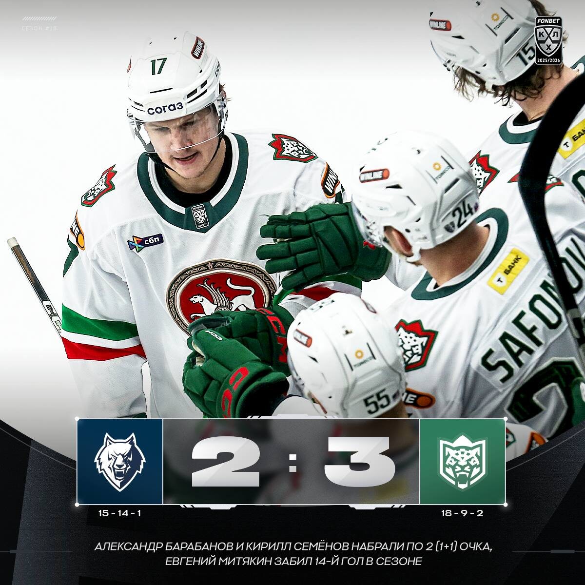 🟢 У «Ак Барса» — две из трёх в сезонной серии татарстанского дерби! #ФонбетКХЛ