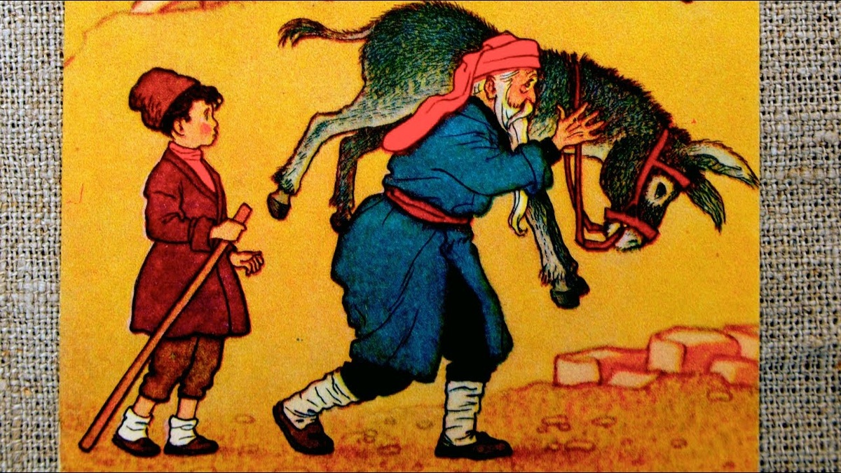 Однажды старик вместе с внуком отправился в далёкое селение. С собой они взяли осла — верного помощника в дороге. Первый этап пути