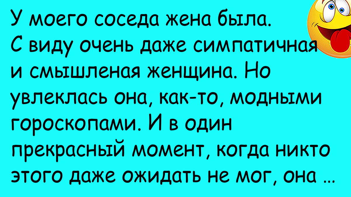 Сосед недавно такую историю рассказал, что я полдня пребывал в невероятно веселом настроении. А вот сам сосед был не очень весел. А всё дело в его жене. Так вот, жена его не так давно гороскопами увлеклась. Ну, знаете там, кто под какой звездой родился, кто есть кто по гороскопу, и так далее. Я если честно не понимаю, как это работает? Ведь людей на планете много, и не нельзя их всех под одну гребенку грести. Характер у всех разный, да и окружение, где они живут. А в гороскопах нас убеждают, что есть люди, которые в год рыбы родились, овцы, индюка и т.п. И в зависимости от этого у них вся жизнь складывается. Короче, насмотрелась она у него этих гороскопов, журналы разные напокупала, с интернета кучу всего понаскачивала. И начала жить по советам звезд. Ну или тех людей, кто все эти гороскопы составляет. Например, если сегодня нельзя на работу идти, так как там буде ждать неудача, то придумывает отговорки, чтобы на работу не ходить. Если в гороскопе написано, что встречи с незнакомыми лю