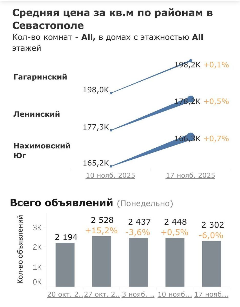 📊 Сравнение средней цены за м² в Севастополе: октябрь → ноябрь Анализирую рынок каждую неделю — делюсь свежими наблюдениями по трём ключевым районам города. 📍 Гагаринский район 27 октября: 196,4 тыс./м² 17 ноября: 198,2 тыс./м² 🔼 Рост: +1,8 тыс./м² Гагаринский стабильно удерживает лидерство, спрос не падает — район продолжает дорожать. 📍 Ленинский район 27 октября: 175,9 тыс./м² 17 ноября: 178,2 тыс./м² 🔼 Рост: +2,3 тыс./м² Цены постепенно растут на фоне ограниченного предложения в центре. 📍 Нахимовский район 27 октября: 165,6 тыс./м² 17 ноября: 166,3 тыс./м² 🔼 Рост: +0,7 тыс./м² Незначительное, но устойчивое повышение стоимости. 📈 Количество объявлений С 20 октября рынок вырос до максимума в конце месяца, затем пошла корректировка — предложение сократилось примерно на 6% к 17 ноября. Меньше объявлений — выше конкуренция среди покупателей. Рынок Севастополя постепенно подрастает по всем районам. Если думаете о продаже или покупке — самое время рассматривать вариан