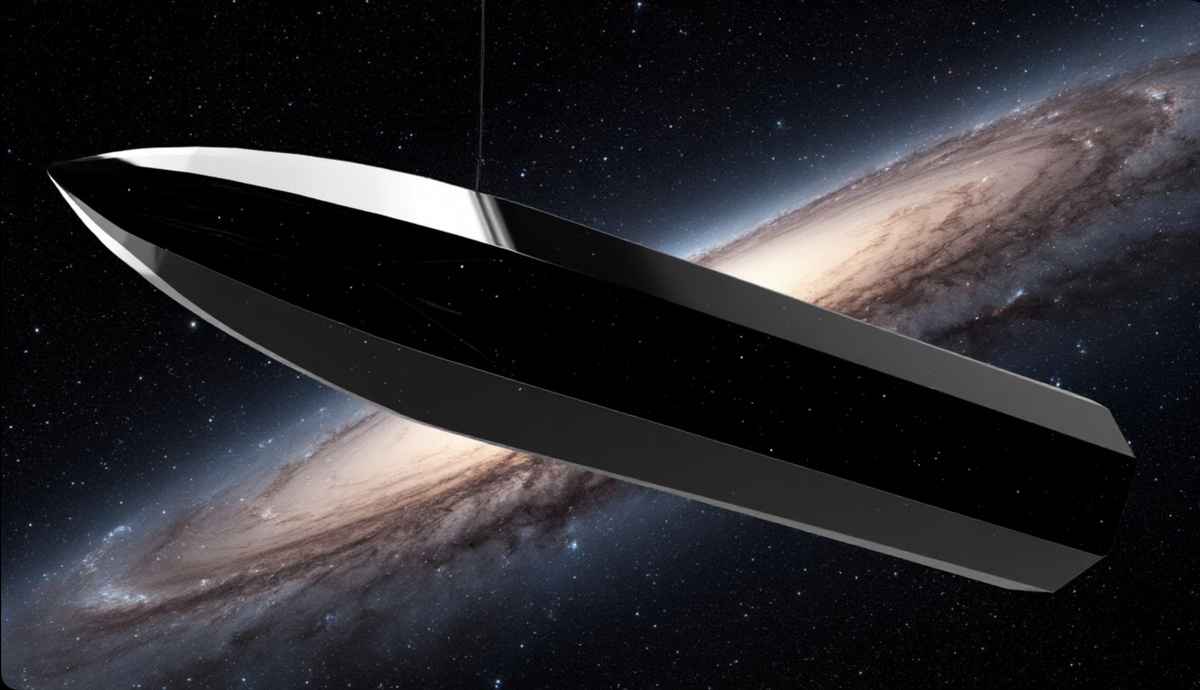 Гигантская, идеально гладкая структура, напоминающая по форме вытянутый кристалл чёрного обсидиана. Он не отражал свет, а словно поглощал его, создавая вокруг себя ореол искажённого пространства. Его размеры были пугающими — он в несколько раз превосходил «Герцен».
